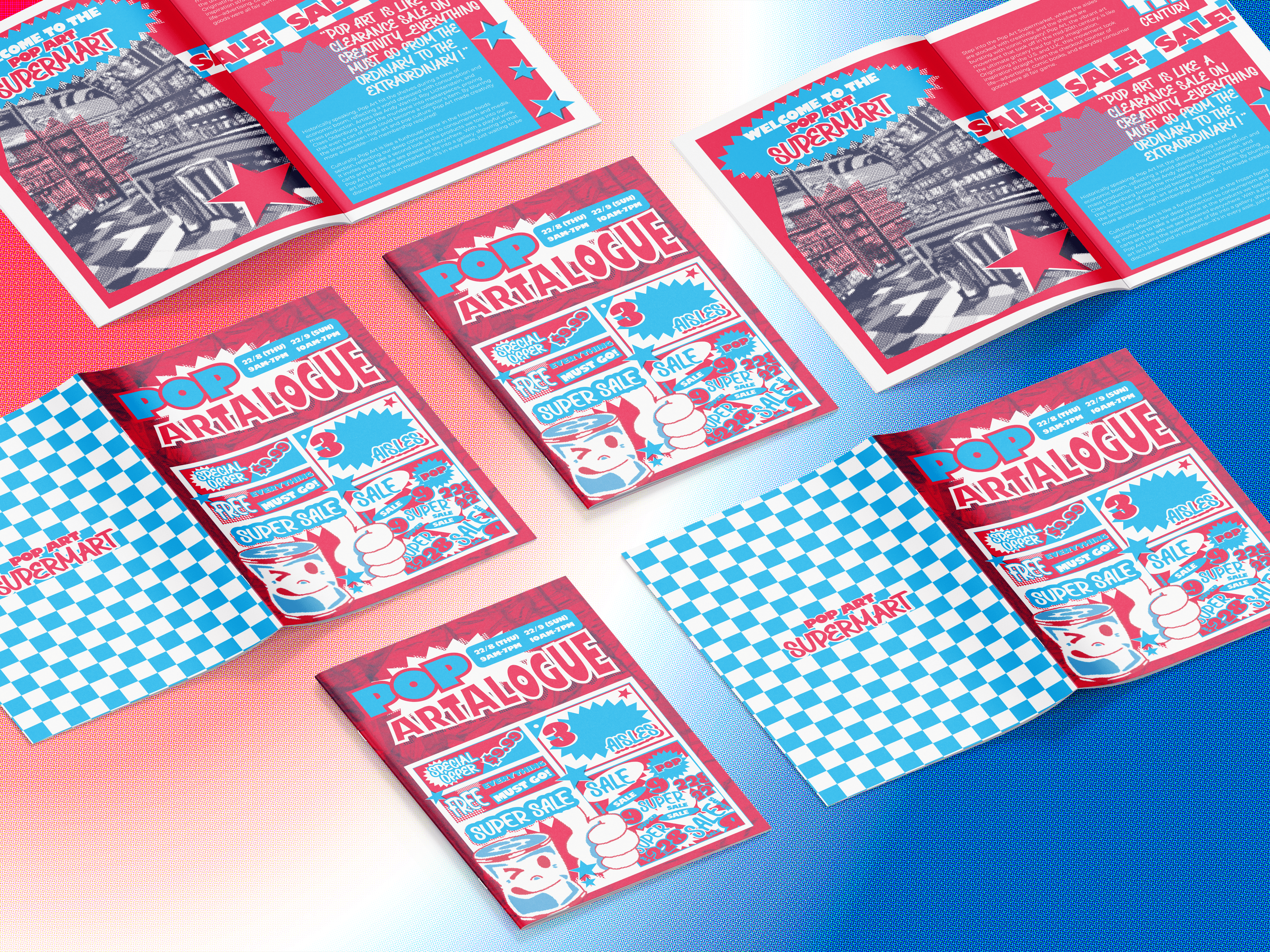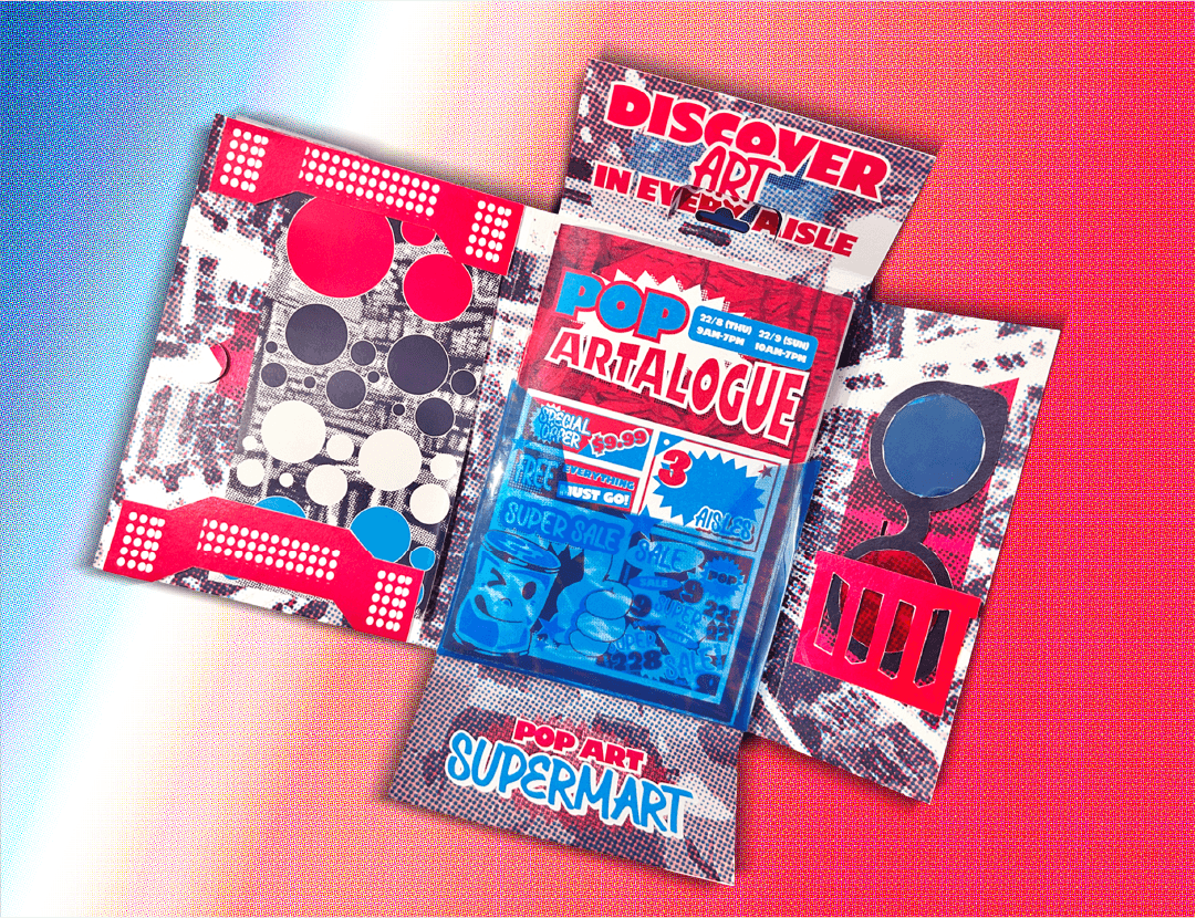 FOR THIS PROJECT, WE WERE TASKED WITH SELECTING AN ART MOVEMENT AND DESIGNING A MUSEUM BROCHURE BASED ON THAT MOVEMENT USING A STRICT DUOTONE COLOUR SYSTEM. I CHOSE POP ART AND DEVELOPED THE CONCEPT OF “POP ART SUPERMART,” WHERE THE BROCHURE IS DESIGNED TO RESEMBLE A SUPERMARKET CATALOG. INSPIRED BY POP ART’S RELATIONSHIP WITH MASS PRODUCTION, ADVERTISING, AND EVERYDAY CONSUMER GOODS, THE BROCHURE PRESENTS ARTISTS AND THEIR WORKS AS DIFFERENT “AISLES” FOR DISCOVERY.