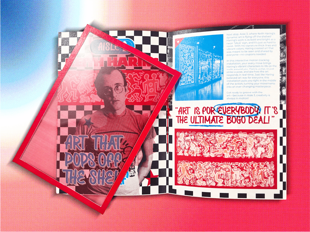 THE CONTENT WAS THEN FOCUSED AROUND THREE INFLUENTIAL ARTISTS, ANDY WARHOL, KEITH HARING, AND YAYOI KUSAMA. EACH ARTIST WAS PRESENTED AS A DIFFERENT AISLE WITH INTERACTIVE ELEMENTS DESIGNED AROUND THEIR DISTINCT VISUAL STYLES, ENCOURAGING VISITORS TO ENGAGE WITH THE BROCHURE WHILE LEARNING ABOUT THEIR WORK AND CONTRIBUTIONS TO POP ART.