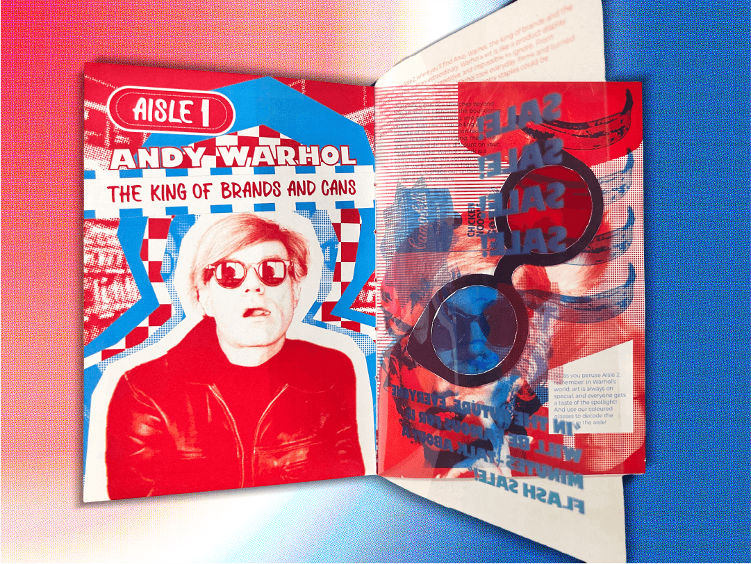 A POP ART MUSEUM BROCHURE DESIGNED USING DUOTONE VISUALS AND RETAIL-INSPIRED GRAPHICS TO CELEBRATE POP ART’S ROOTS IN MASS CONSUMPTION AND POPULAR CULTURE.
