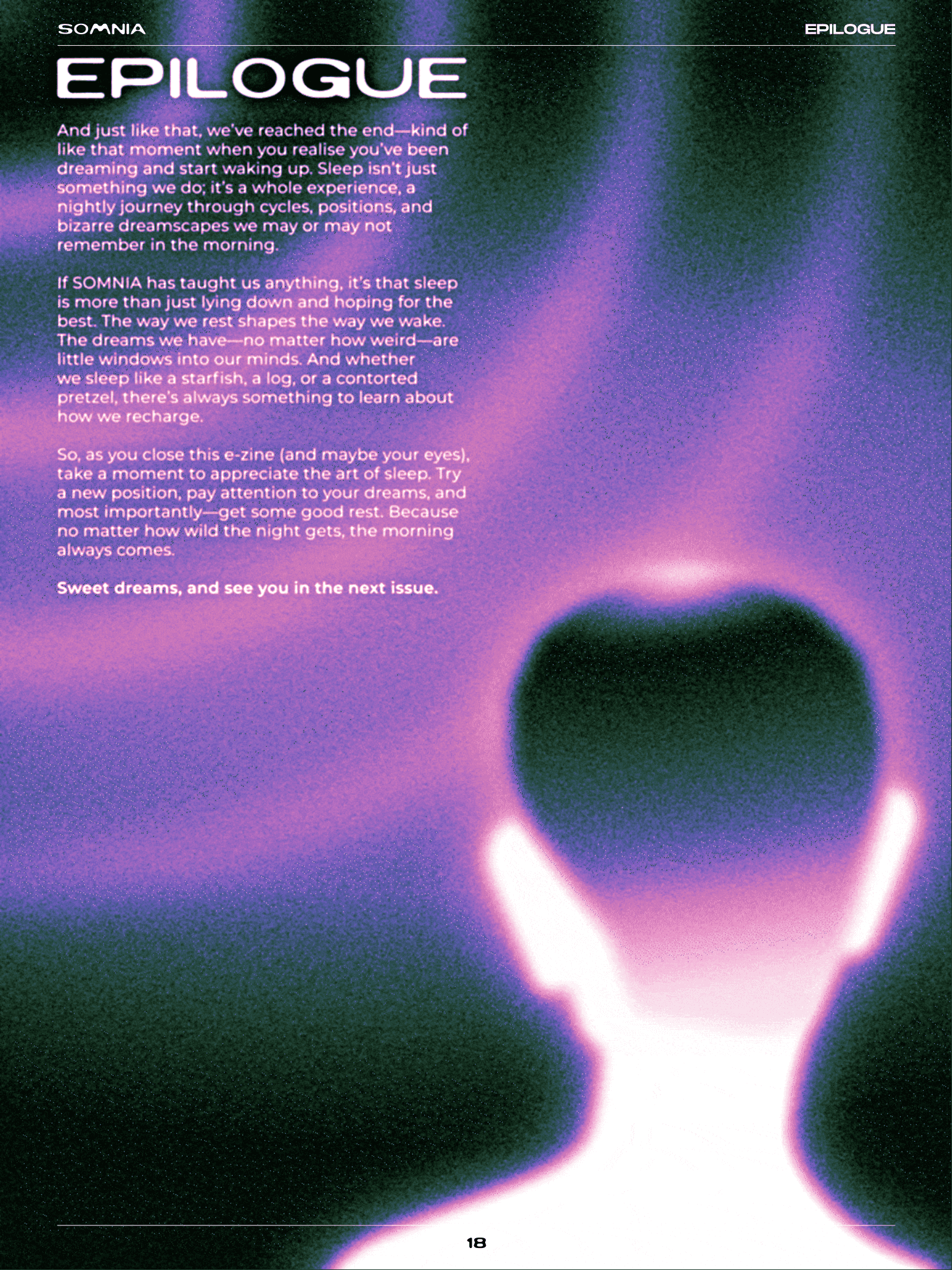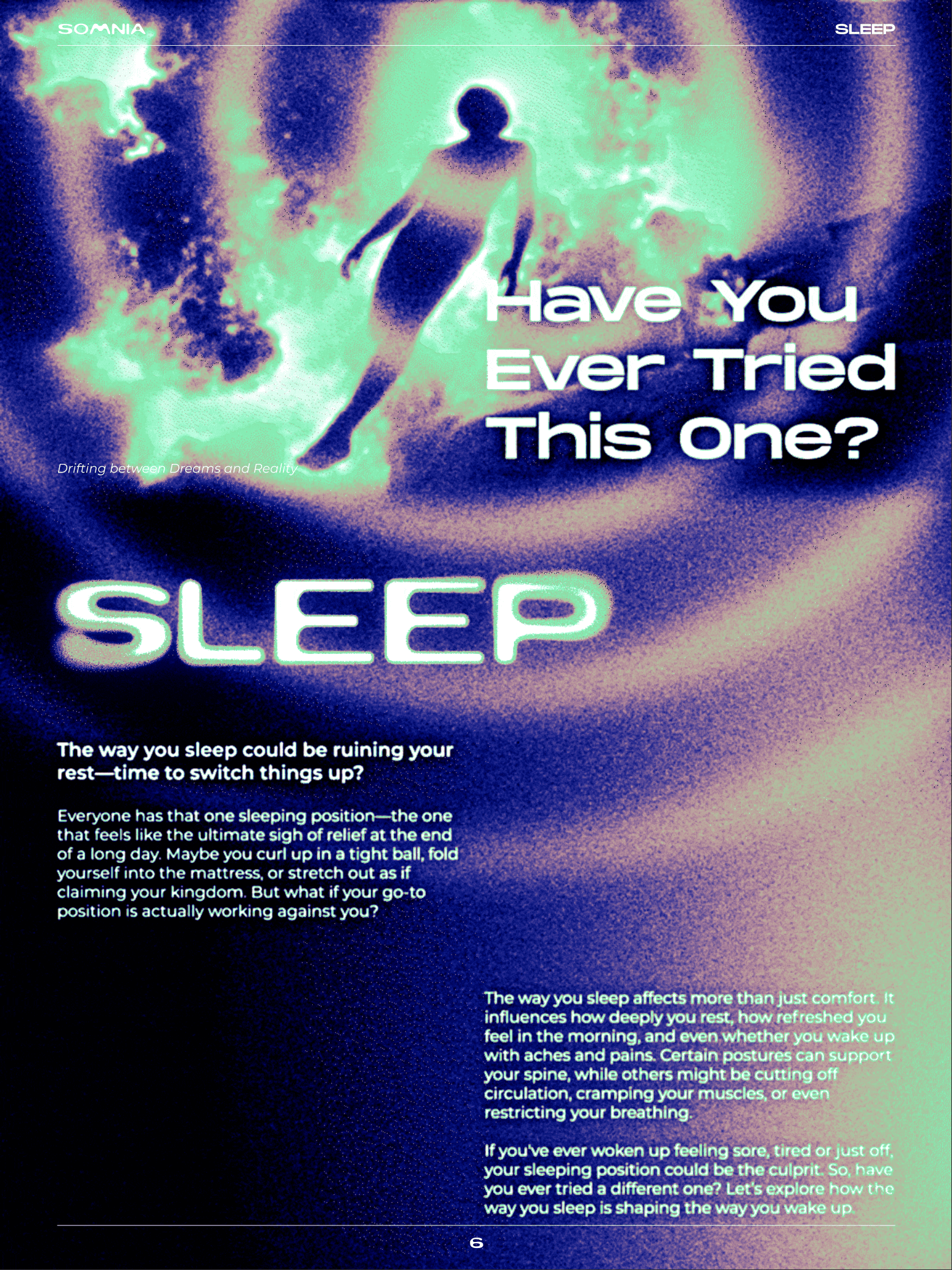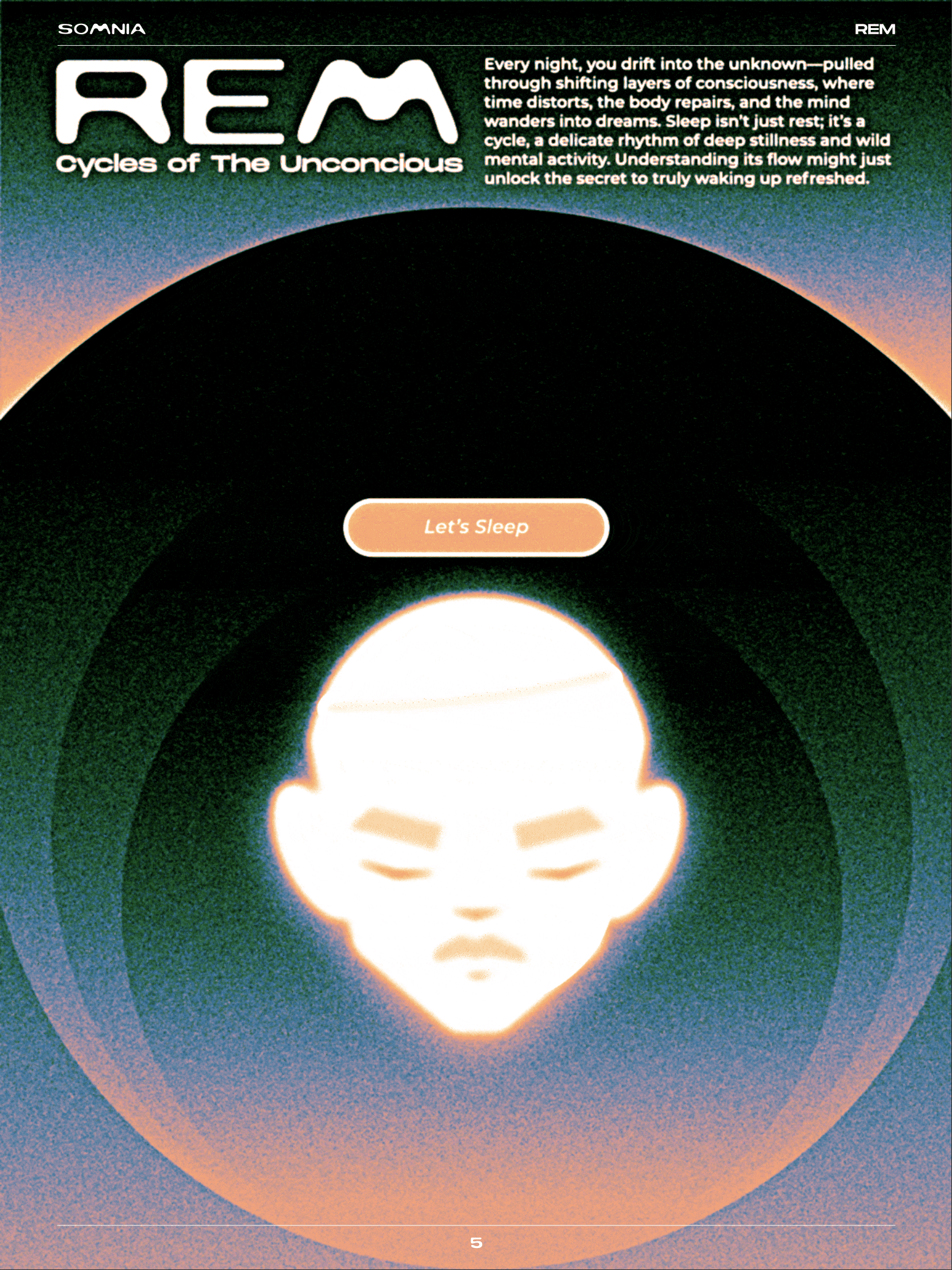 THE FINAL OUTCOME IS AN INTERACTIVE DIGITAL ZINE THAT COMBINES EDITORIAL DESIGN, MOTION GRAPHICS, AND USER INTERACTION INTO A SINGLE EXPERIENCE. SOMNIA GUIDES READERS THROUGH THE DIFFERENT STATES OF SLEEP WITH DREAMLIKE VISUALS, FLUID TYPOGRAPHY, AND IMMERSIVE MOTION ELEMENTS. INTERACTIVE FEATURES, INCLUDING CLICKABLE BUTTONS AND AN EXPLODED VIEW INFOGRAPHIC THAT ACTIVATES ON PRESS, ENCOURAGE USERS TO ENGAGE WITH THE CONTENT AND DISCOVER INFORMATION IN A PLAYFUL AND EXPLORATORY WAY.