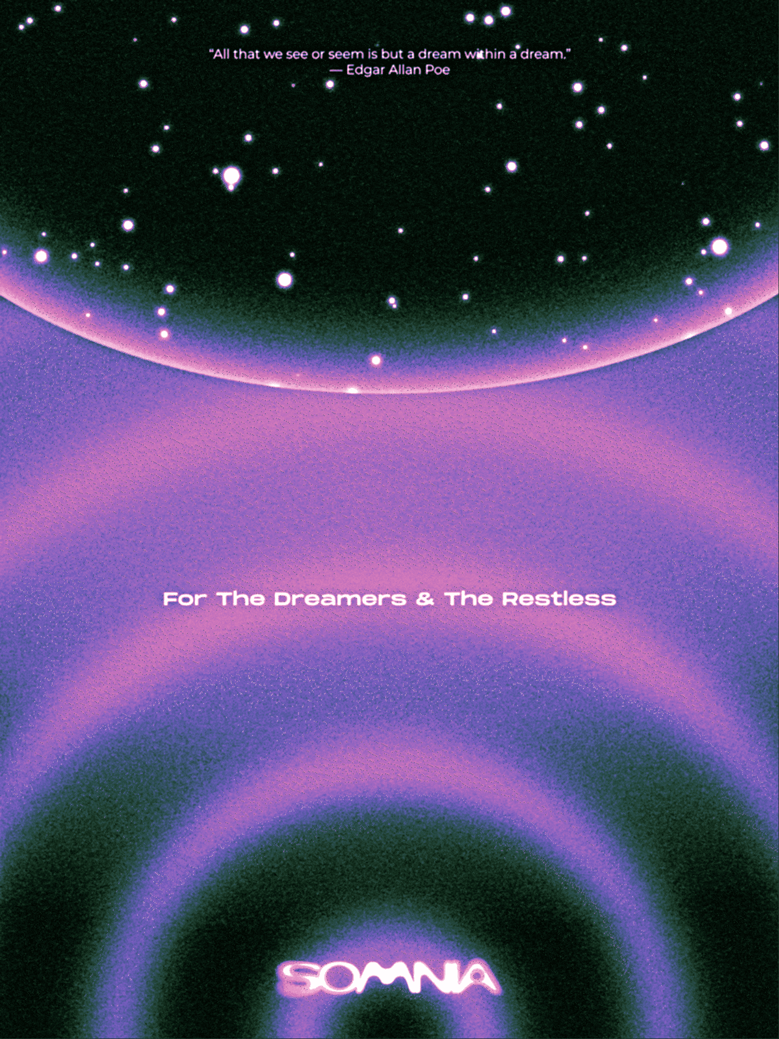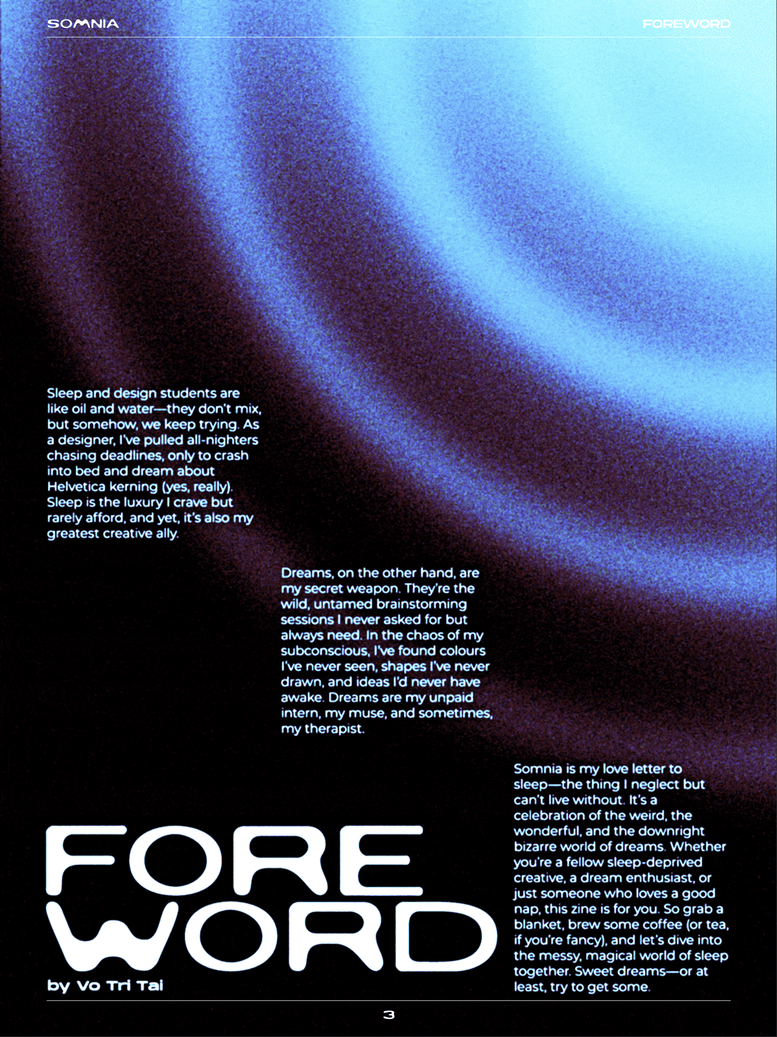 FOR THIS PROJECT, WE WERE TASKED WITH DESIGNING AN INTERACTIVE ZINE USING INDESIGN THAT INCORPORATES MOTION GRAPHICS AND DIGITAL INTERACTIONS. SOMNIA EXPLORES THE EXPERIENCE OF SLEEP AND DREAMING THROUGH THREE SECTIONS: SLEEP, REM, AND DREAM. EACH SECTION VISUALLY REPRESENTS DIFFERENT STATES OF REST AND CONSCIOUSNESS. THE ZINE FEATURES SURREAL AND DREAMLIKE VISUALS WITH GRAIN, GLOW, AND SOFT GRADIENTS TO CREATE A DARK NIGHT ATMOSPHERE. TYPOGRAPHY IS TREATED AS A VISUAL ELEMENT, WITH BLOBBY AND LIQUID LIKE FORMS THAT FEEL FOGGY AND ORGANIC, REINFORCING THE SENSE OF DRIFTING BETWEEN REALITY AND DREAM.