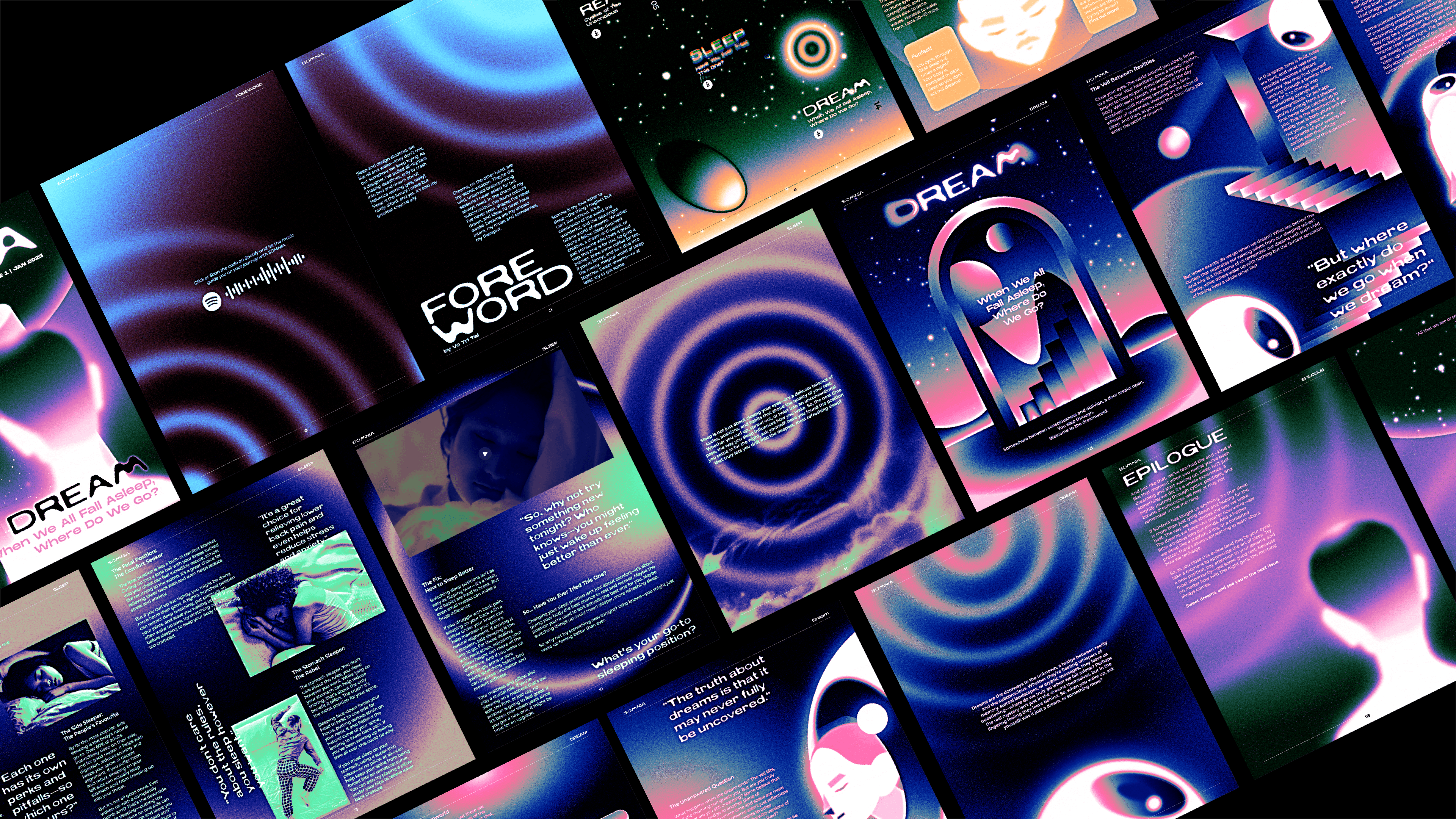 TO CAPTURE THE MOOD OF SLEEP AND DREAMING, THE VISUAL LANGUAGE WAS BUILT AROUND SURREAL AND DREAMY GRAPHICS WITH SOFT GRADIENT COLOURS, GRAIN TEXTURES, AND SUBTLE GLOW EFFECTS. THE TYPOGRAPHY WAS DESIGNED TO FEEL FLUID AND ORGANIC, WITH BLOBBY AND FOG LIKE FORMS THAT CREATE A SENSE OF MOVEMENT AND DISTORTION. TO GENERATE INTERESTING COLOUR TRANSITIONS EFFICIENTLY, I USED CURVE ADJUSTMENTS TO CREATE UNIQUE GRADIENTS WHILE WORKING WITHIN THE TIME CONSTRAINTS. INTERACTIVE FEATURES SUCH AS BUTTONS, EMBEDDED MOTION GRAPHICS, AND NAVIGATIONAL ELEMENTS WERE INTEGRATED TO ALLOW READERS TO EXPLORE THE CONTENT IN A MORE DYNAMIC WAY.