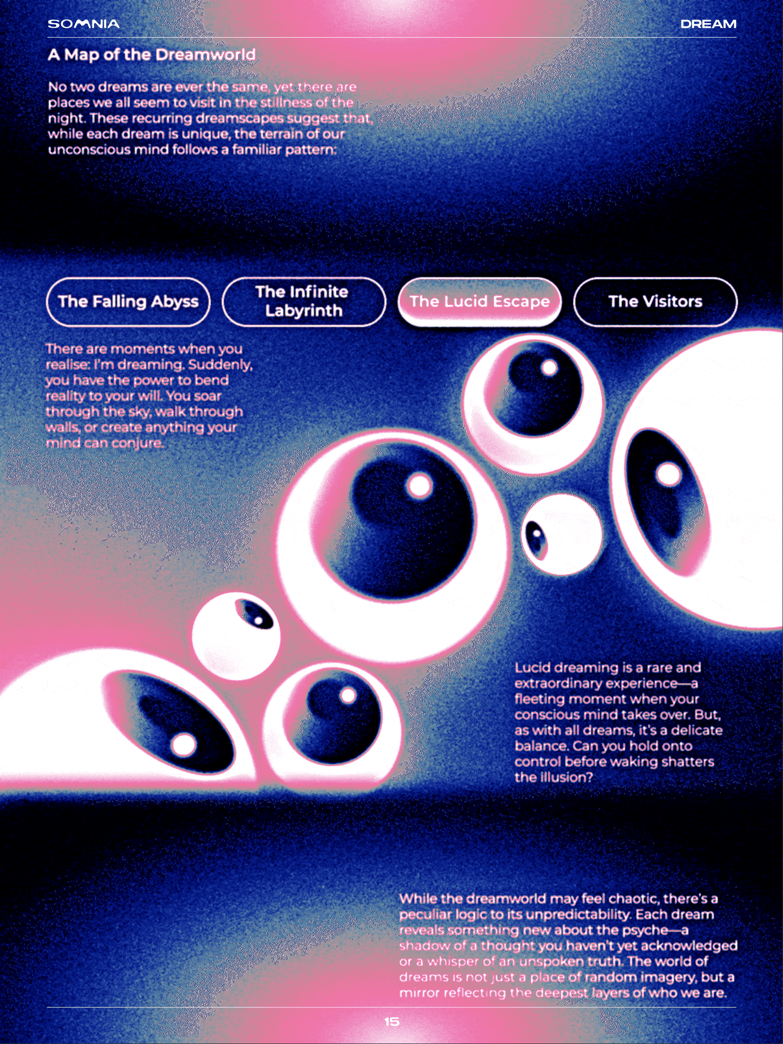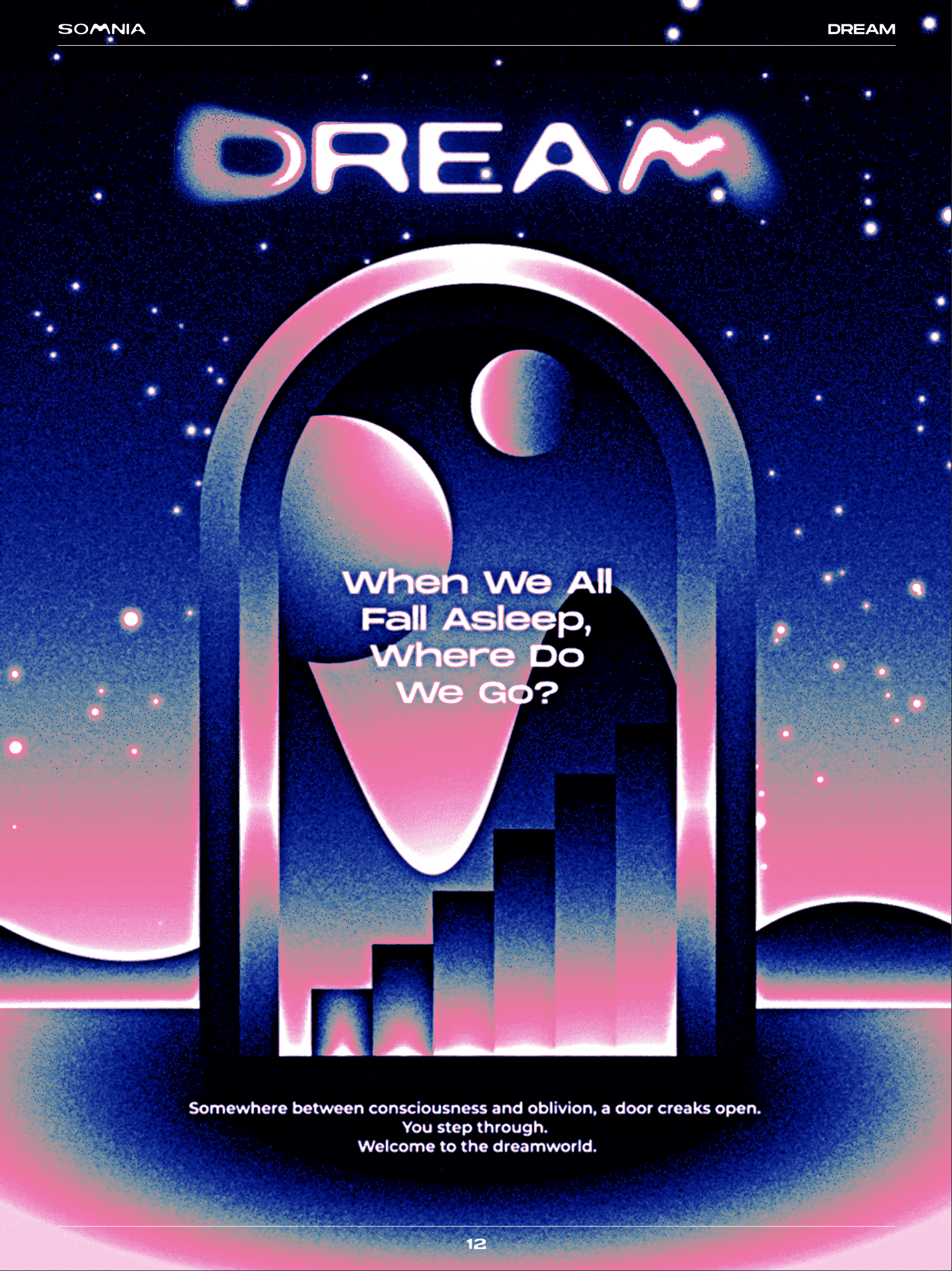 SOMNIA IS AN INTERACTIVE DIGITAL ZINE THAT EXPLORES THE WORLD OF SLEEP AND DREAMS THROUGH MOTION GRAPHICS, SURREAL VISUALS, AND IMMERSIVE INTERACTION.